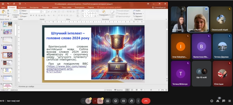 13 листопада 2025 року в онлайн-форматі відбувся семінар «Нейромережі та штучний інтелект для сучасної освіти». Захід об’єднав педагогів, які прагнуть розвиватися, освоювати сучасні цифрові інструменти та відповідати викликам часу. Спікер заходу – Жалко Тетяна Йосипівна, кандидат філологічних наук, доцент кафедри теорії та методики викладання шкільних предметів Волинського ІППО, яка доступно й ґрунтовно розкрила суть сучасних технологій, пояснивши, що таке штучний інтелект, як працюють нейромережі та які процеси лежать в їх основі. Педагоги отримали змогу побачити, що ШІ – це не абстрактна ідея, а реальний інструмент, здатний ефективно допомагати вчителю у щоденній роботі.