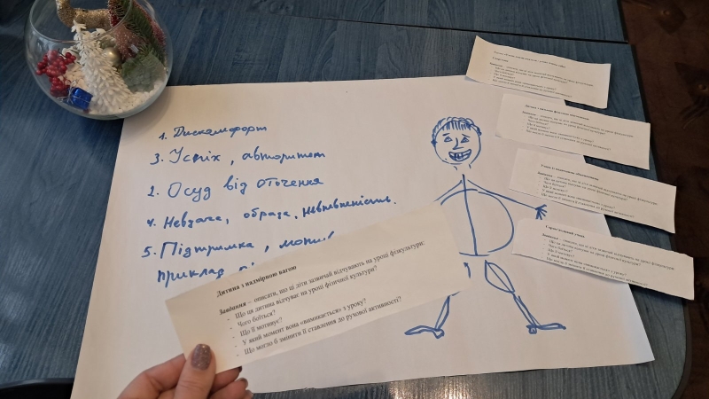 Практична частина семінару була присвячена глибокому осмисленню ролі вчителя в очах учня. Юлія Василівна провела вправу «Учень очима вчителя», під час якої педагогів поділили на групи та запропонували картки з образами учнів: спортсмена, дитини з надмірною вагою, сором’язливого учня, дитини з низьким рівнем фізичної підготовки, учня з медичними обмеженнями. Завданням було описати, що ці діти зазвичай відчувають на уроці фізкультури, чого бояться, чого очікують від учителя. Подальше обговорення стало емоційним і глибоким, адже дозволило педагогам подивитися на урок очима дитини та переосмислити власну педагогічну позицію.
